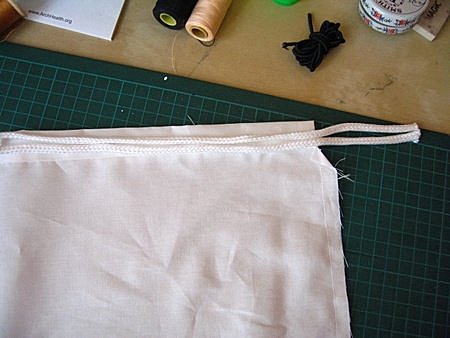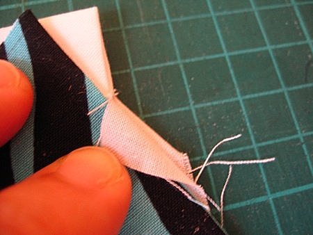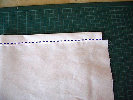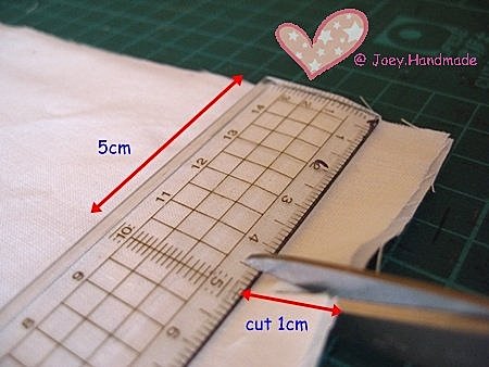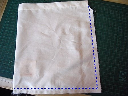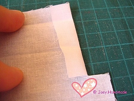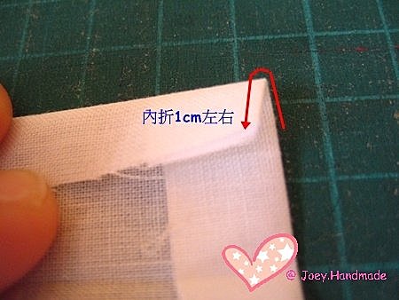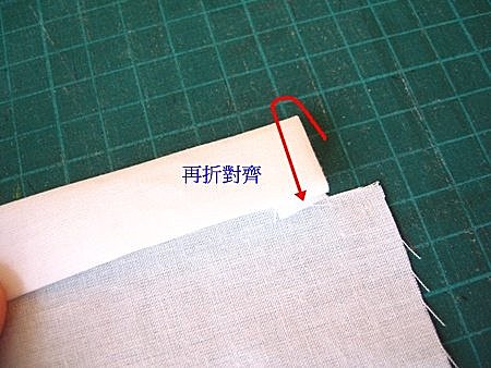 在斜角部份兩邊折入(因為是白色的布 所以用藍色的擋一下較看的到)